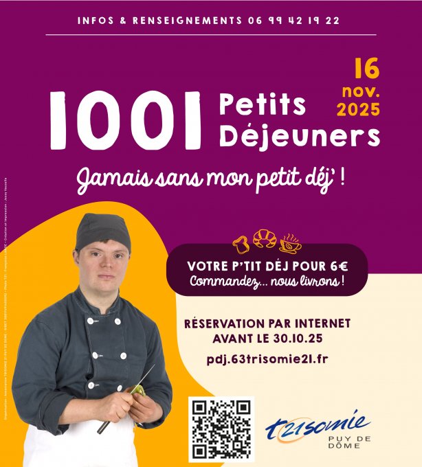 Pour cette 18ème édition, qui aura lieu le 16 novembre, l'équipe organisatrice des 1001 petits déjeuners espère le même succès que les années précédentes. pour commander des petits déjeuners comme pour devenir bénévole d'un jour, vous pouvez vous inscrire sur notre site https://pdj.63trisomie21.fr/